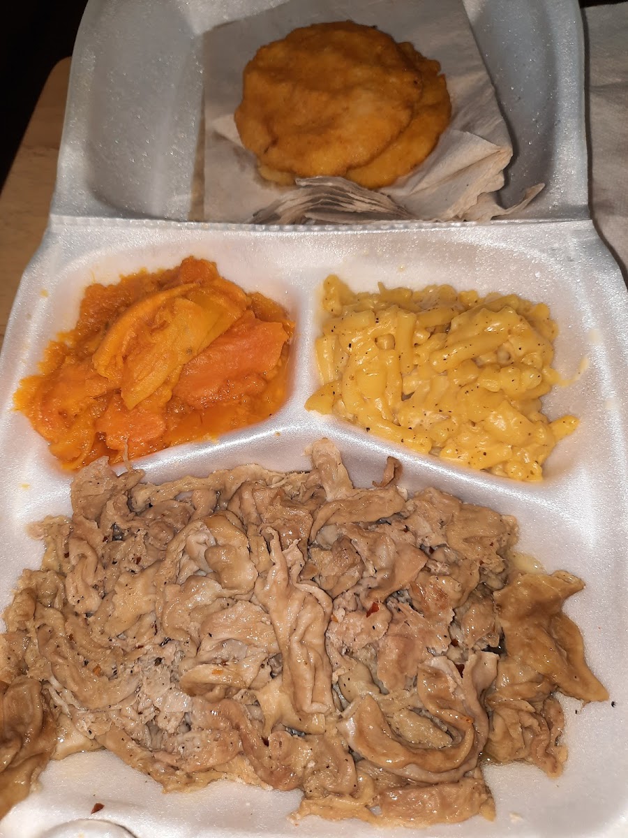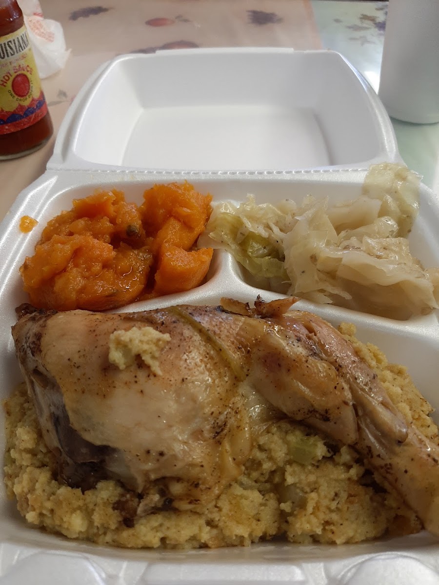 The Koolaid was excellent! The sweet potatoes and cabbage were great. I loved the chicken and dressing, which were better with cranberry sauce. The service was good, and the doors were open a little early.
